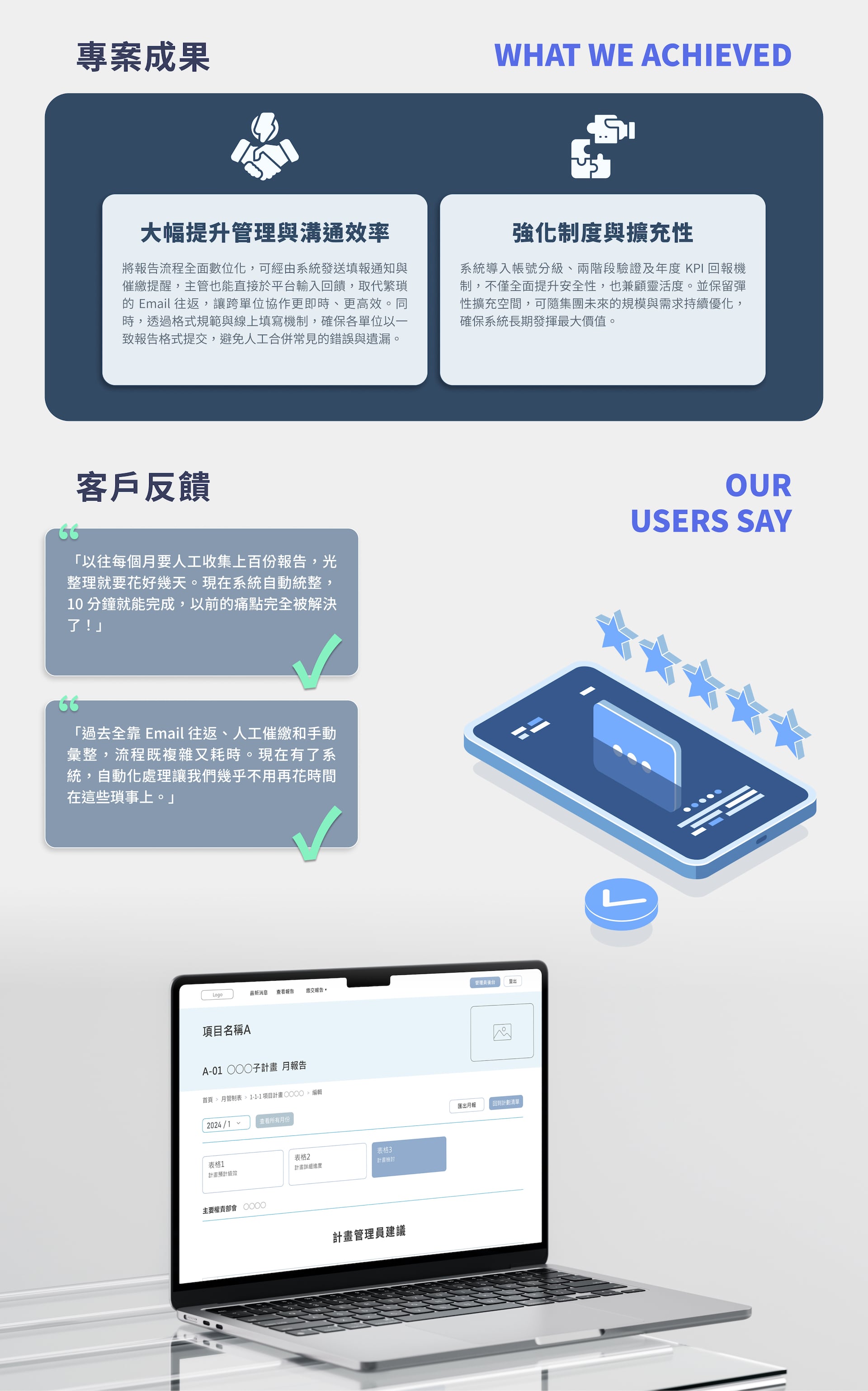 - Strong security with tiered user access, two-step verification, and annual KPI tracking.